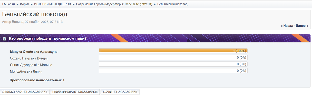 Цитата: N1ghtW01f от Сегодня в 14:18:19Вообще по лору есть три развилки, куда он может перейти: "Днепр" (клуб из родного города, хотя не провёл в нём ни единого дня), ФК Минск (ИРЛ тренирует сейчас детей 2008 и 2009 года) и "Ислочь" (играл за молодёжную команду). Хотя да, вопрос всё ещё открыт. С другой стороны, вратари ведь люди странныеЦитата: Single_scouse от 27 ноября 2025, 22:59:12По таблице мы по-прежнему наверху и...и чем дольше мы там находимся, чем больше мне кажется, что по окончанию сезона мне стоит уйти, пока всё хорошо. Сложно это объяснить, но как будто мне нужен новый вызов.