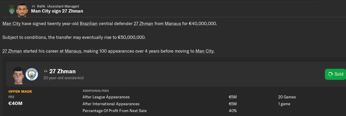 Цитата: N1ghtW01f от Сегодня в 16:11:10клауза в 40% от профита с перепродажиТрансфер классный, но я обычно выбиваю клаузу от всей суммы продажи, потому что профита же может и не быть
