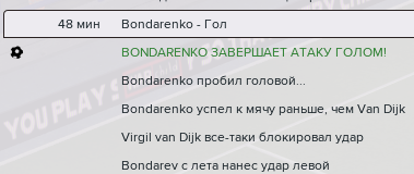Здесь всё ещё интереснее. Просмотр момента в игре показал, что Бондаренко тоже этот гол не забивал :smyle: Его забил АПП Бондарев, оказавшийся в центре штрафной, но игра какими-то неведомыми скриптами записала этот гол на Бондаренко, приписав ему и ван Дейку то, чего они не делали (мяч просто просвистел мимо них в ворота):