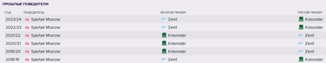 К слову, как-то самой собой московский Спартак и Краснодар стали базовыми клубами сборной: из первого в ней сейчас заиграны 8 игроков, из второго - 4. А с учётом экс-игроков сборной и трансферов за это время - ещё больше :smyle: Оно и не удивительно: в этой ФМ-ной реальности Спартак Массимо Карреры напоминает непобедимый Спартак Олега Романцева 90-х, одержав 6 побед в чемпионате подряд! Краснодар за это время был трижды вторым и дважды - третьим, а Зенит - наоборот :smyle: В целом же, первая тройка за эти шесть сезонов остаётся незыблемой.