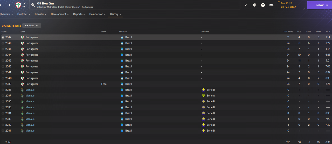 22.01.2036 08 Slow 22 года 187 игр 5 голов -------> Portuguesa 400 евро