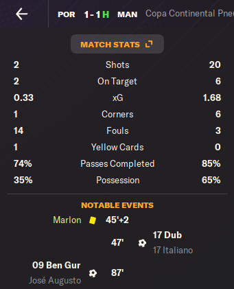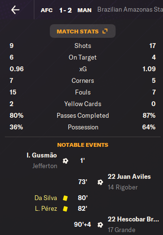 Мы расстреляли множество шансов в молоко, а забили только благодаря Дубу. В концовке наш воспитанник Бен Гур сравнял счет и обеспечил нервную концовку. Но игра закончилась ничьей и Манаус идет дальше, как клуб из более высокой лиги. Но вообще, с учетом того, что играла основа, надо хорошо так прибавлять. Такие матчи никуда не годятся. Получили 235к за участие в первом раунде.