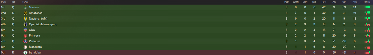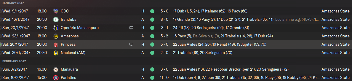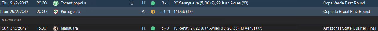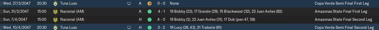 После таких результатов за полуфинал чемпионата штата с Амазонасом было немного тревожно. И не зря. Нас в гостевом матче устраивала ничья, но хозяева забили уже на первой минуте, у нас же игра никак не клеилась. Еще и лидер Дуб сломался до игры на неделю, а Пейси провел просто отвратительный матч. Зарешали замены. Ригобер вышел на поле впервые в сезоне (и вообще уже давно висит на трансфере). Именно он отправил в прорыв также вышедшего на замену Хуана Авилеса, а тот прошил вратаря и сравнял счет! В концовке было тревожно, Мун один раз нас просто выручил, а потом мы убежали в контратаку и также вышедший на замену Эскобар Бредор даже принес нам победу на последних секундах!