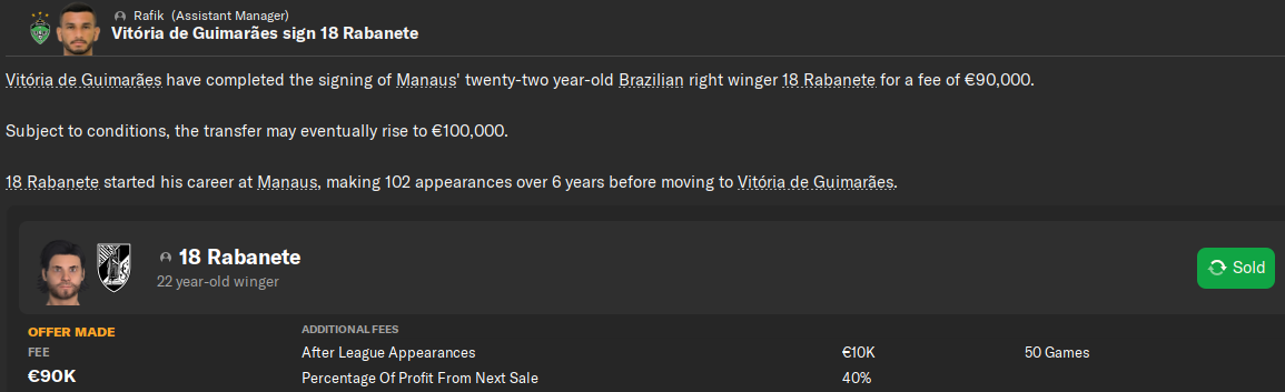 Первым на выход пошел Рабанете. Им интересовались португальцы и Любко не стал сильно упорствовать. Витория Гуимараеш заплатила 90к, еще 10к мы получим после 50 матчей воспитанника за новый клуб. Ну и у нас есть клауза на 40% с профита от перепродажи, на случай если игрок вдруг выстрелит.