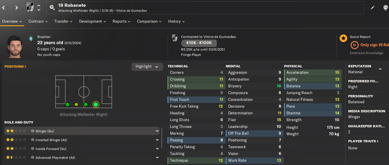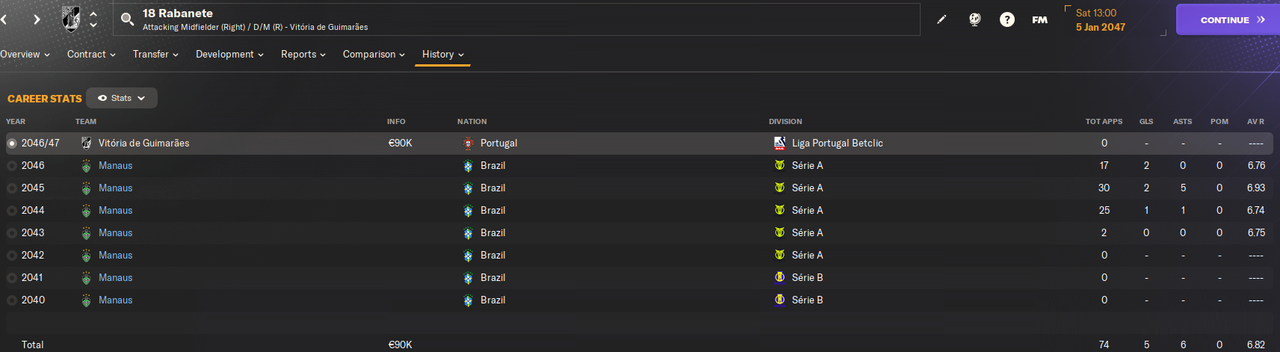05.01.2047 18 Rabanete 22 года 102 игры 7 голов ---------> Vitoria de Guimaraes 90к + 10к за 50 игр + 40% с профита от перепродажи