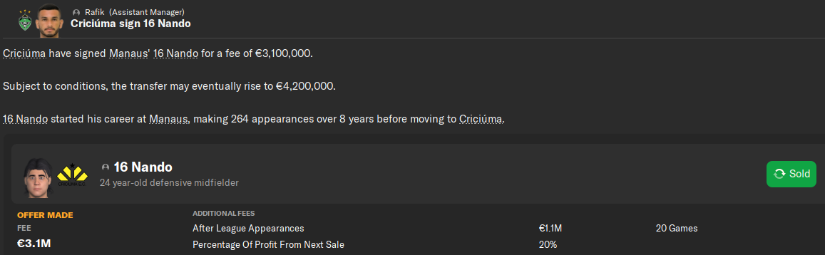 Нандо все время был добротным игрокам, все это время был в ротации и сильно помогал в напряженные моменты, но все же всю свою карьеру сидел в тени Блэквуда, чьим сменщиком он и являлся. В итоге опорнику это надоело и он попросился в другой клуб. Заинтересованных было много, но предложение сделала только Крисиума из Серии В (но с амбициями на промоушен). Любко не сильно торговался и договорились на 3.1 миллиона сразу, 1.1 миллиона после 20 игр (при этом Нандо получил статус только игрока запаса). Ну и 20% с профита от перепродажи, на которые Любко не очень-то рассчитывает.