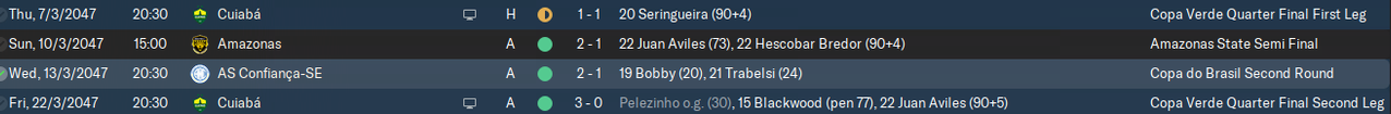 Во втором раунде Кубка Бразилии нам досталась Конфианса, наш давний знакомый еще по Серии С, где команда так и пребывает. Матчи один за другим, но сильно ротировать состав Любко не стал, вышла практически основа и еще в первом тайме решила все вопросы благодаря голам Бобби и Трабелси. В перерыве на поле вышло много резервистов, мы очень быстро пропустили один мяч, но все же дотерпели до конца. 2:1 и мы идем дальше. 263к призовых капнули на наш счет.
