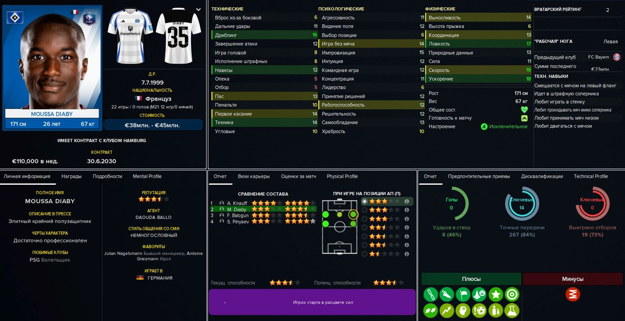Объективно такой игрок, конечно, стоит куда дороже. По зарплате ужиматься он, правда, не захотел, но плюс-минус такие же контракты вскоре придётся выдавать не только ему, так что паниковать не стоит. Отчёт тренера красноречив: кроме небольшого роста (а Мусса и по юношам был мелковат), у него непросто отыскать слабые стороны. Ну а выделятся он великолепными скоростью и ловкостью, отличным дриблингом, стабильностью и профессионализмом. Имеет странный для игрока с такой скоростью мув на привычку принимать пас в ноги.