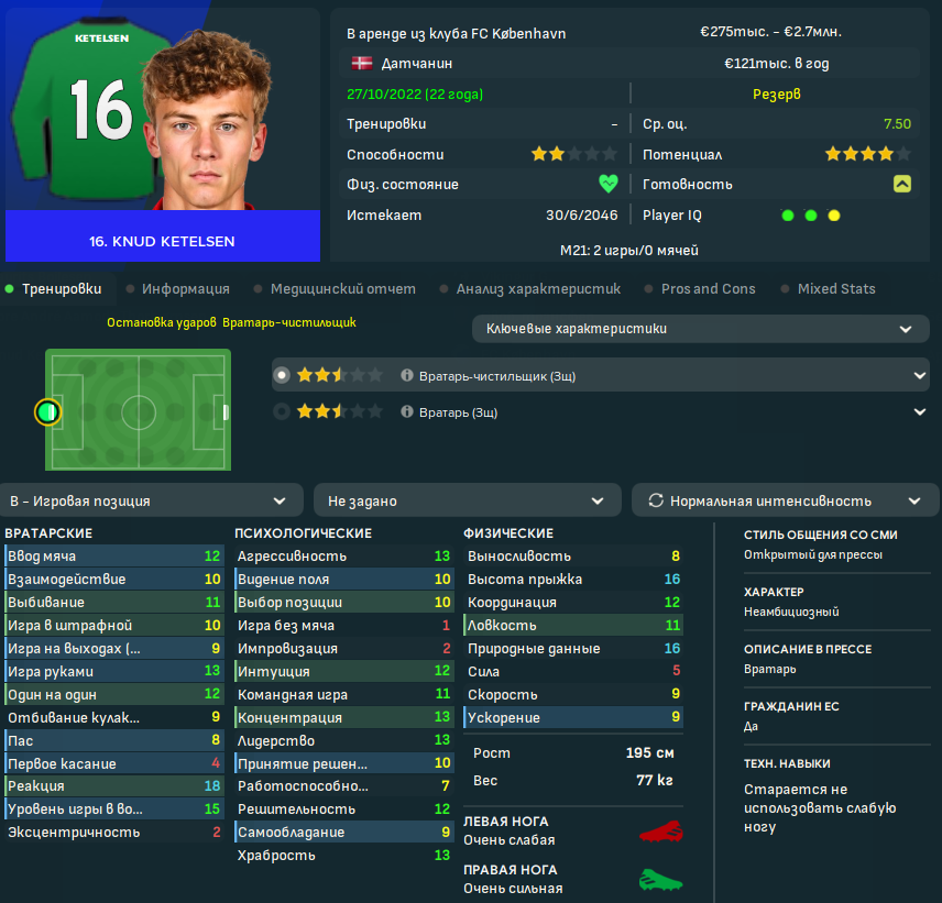 Knud Ketelesen - молодой и перспективный кипер из Копенгагена. Взял в аренду, и через несколько матчей понял, что выкуплю его за прописанные 1.2 млн. (Твейт, конечно, неплох, но уже давно достиг пика потенциала). Но случился конфуз - проглядел я, что договаривался использовать его как классического вратаря, а в моей схеме чистильщик. Для меня - мелочь, для Копенгагена - трагедия. Отозвали парня аккурат перед стартом в ЛЧ. Обидно. Спойлер: в конце сезона я его выкупил, правда за 2.1 млн...