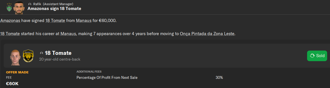 Томате из того же овощного выпуска как и первые двое, но он все же чуть получше. Об этом намекают и 6 матчей за Манаус. Но потенциала там немного и шансов заиграть нет. Сосед по городу Амазонас предложил 60к и Любко согласился. Все же их наш герой рассматривает скорее как друга-соперника, а не ривала.