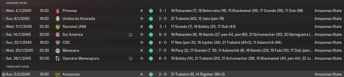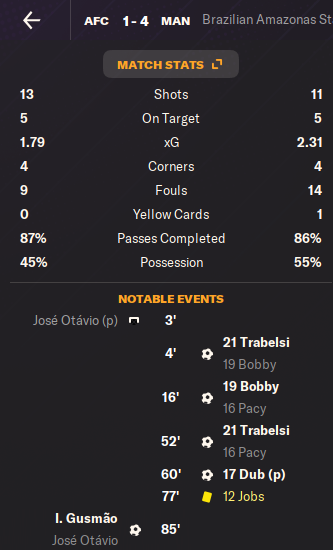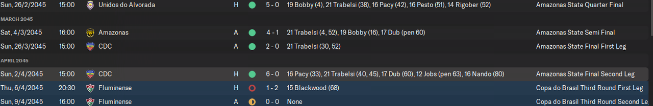 В самом начале Эдвард потащил пенальти и хозяева поникли. Уже в ответной атаке Трабелси открыл счет, а дальше мы играли в свое удовольствие. Трабелси забил еще раз, у Пейси 2 ассиста, у Бобби 1+1.  Легко проходим в финал и квалифицируемся в Кубок Бразилии на следующий сезон.