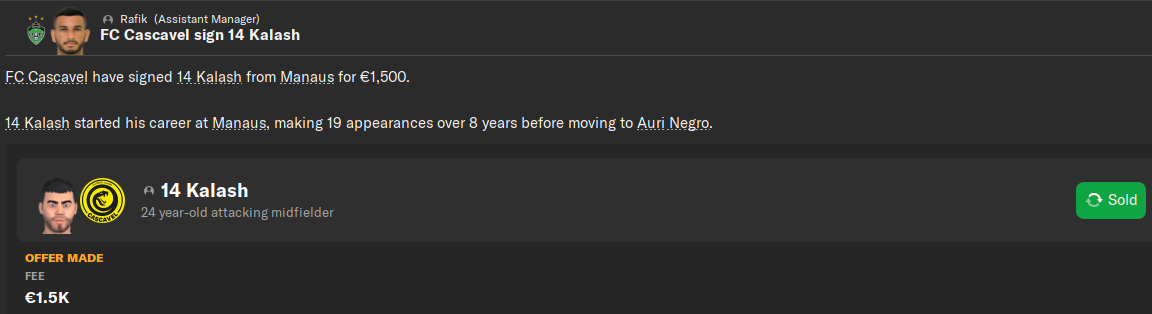 Калаш уже давно сидел в дубле, Любко про него даже успел забыть, а тут по нему сделал предложение клуб из Серии С. Ну а наш герой только и рад, 1.5к тоже деньги. Калаш получал достаточно много шансов и сыграл за Манаус 19 матчей, даже забил 4 гола, но толком себя не проявил. А парню уже 24 года.