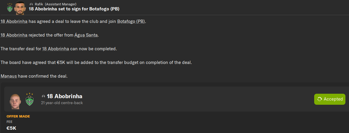 Абобринью Любко готов был и не продавать, он был бы 4-5 защитником в ротации, но тот сам захотел уйти. Ботафого из Серии В предложил и Любко не стал удерживать игрока. У 21-летнего защитника 4 игры за Манаус. Удачи в дальнейшей карьере.