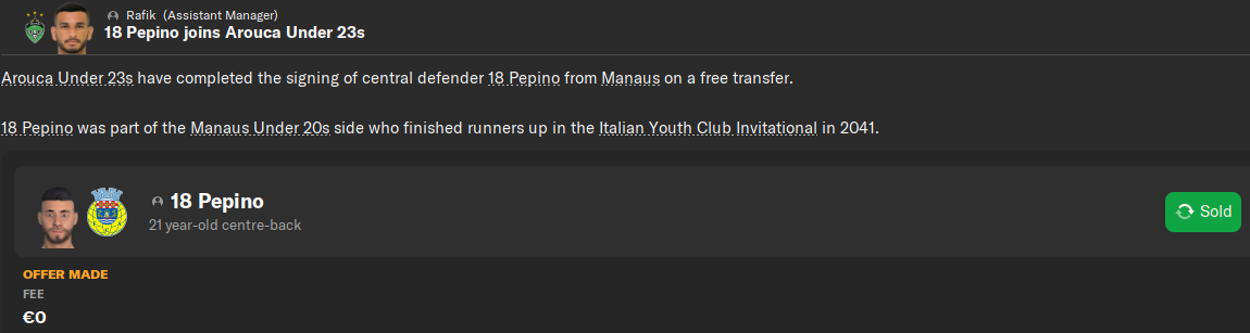 Пепино не так уж и плох, но ему уже 21 и шансов заиграть в основе ровно никаких. Так что воспитанник был отпущен в Португалию бесплатно. У него как и у Цеболы лишь один матч за Манаус.