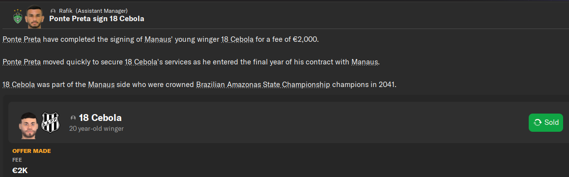 Цебола никак себя не проявил и перспектив там тоже немного. Любко бы отдал 20-летнего левого вингера и бесплатно, а так еще и удалось выручить, которые тоже на дороге не валяются. Понте Прета - клуб Серии С. Надеюсь там наш воспитанник проявит себя. За все время у него лишь один матч за Манаус.