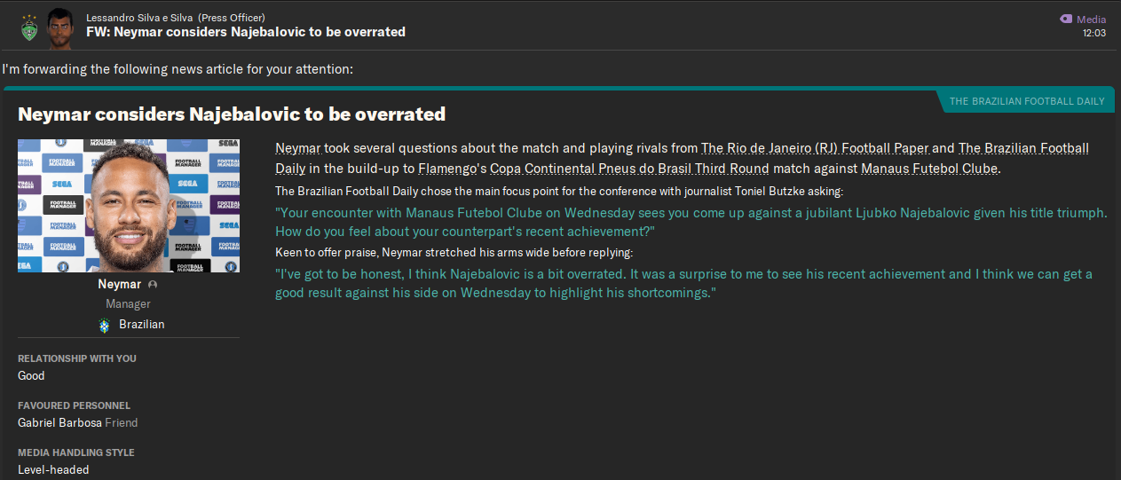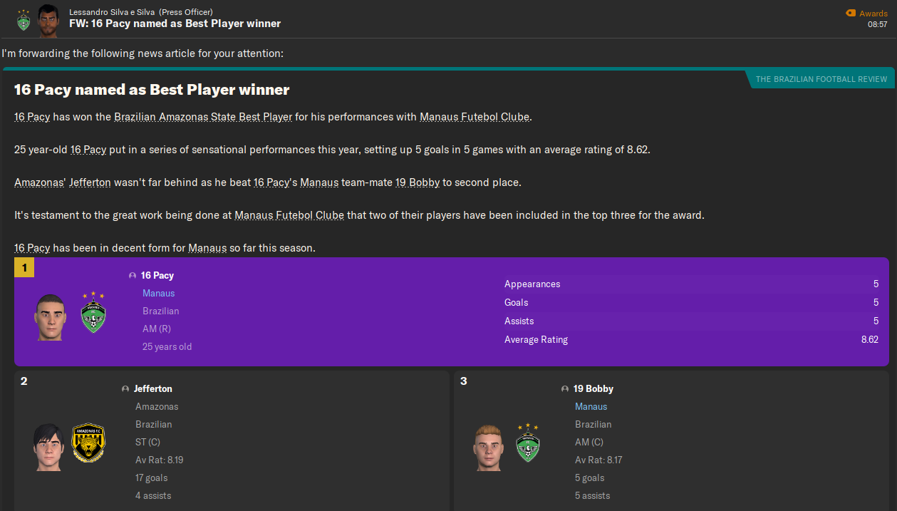 И сразу, вот прямо с ходу идет очень интересный арчибальда и один из самых значимых игроков сейва. Парень, как Любко и предсказывал заиграл именно в центре,  с первого же сезона начал выходить на поле в ротации, а со второго уже стал игроком основы. Прошел с Манаусом весь путь от Серии С до элиты. Вылетал из Серии А еще тогда, но помог команде вернуться. В общей сложности провел в Манаусе 12 лет и сыграл 449 матчей, забил 54 гола. А потом ушел за весьма солидные 4 миллиона в Ферровиариу: