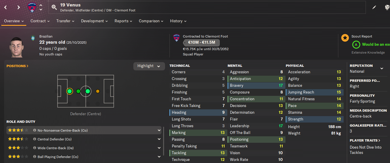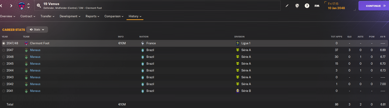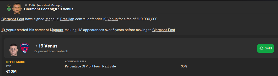 10.01.2048 19 Venus 22 года 113 игр 6 голов -----------> Clermont Foot 10 миллионов + 30% с профита от перепродажи