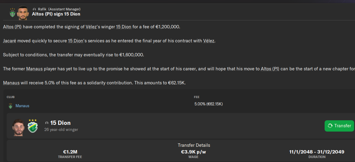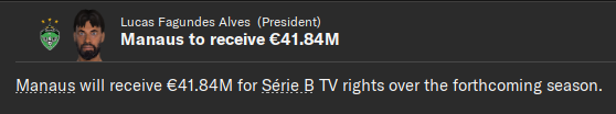 Дион, которого Любко не так давно сплавил в Аргентину там неожиданно раскрылся и Алтош выкупил инсайда за 1.2 миллиона евро! У нас была клауза на 20% с профита и Манаус получил в зачет миллиарда 155к сразу и 86к в рассрочку!