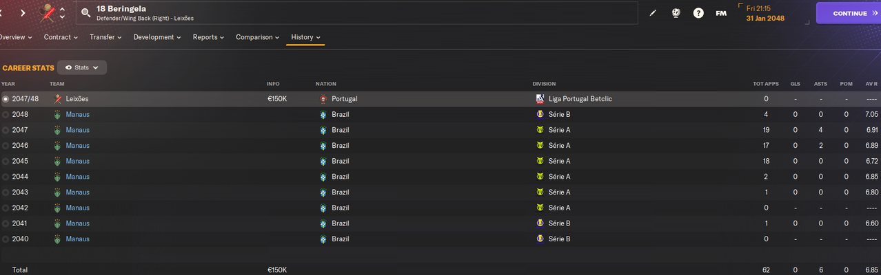 31.01.2048 18 Beringela 23 года 94 игры 1 гол ----------> Leixoes 150k + 50k за 20 матчей + 30% с профита от перепродажи