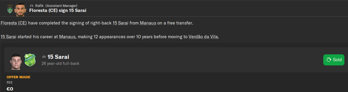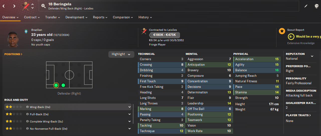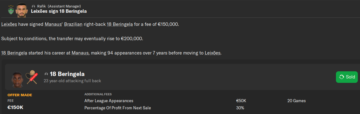 Еще один правый защитник поехал за 150к в Португалию. У нас клауза на 30% с профита от перепродажи, а так же Манаус получит еще 50к, когда Берингела сыграет за Leixoes 20 матчей. Что далеко не факт, так как статус 23-летнего защитника - игрок замены: