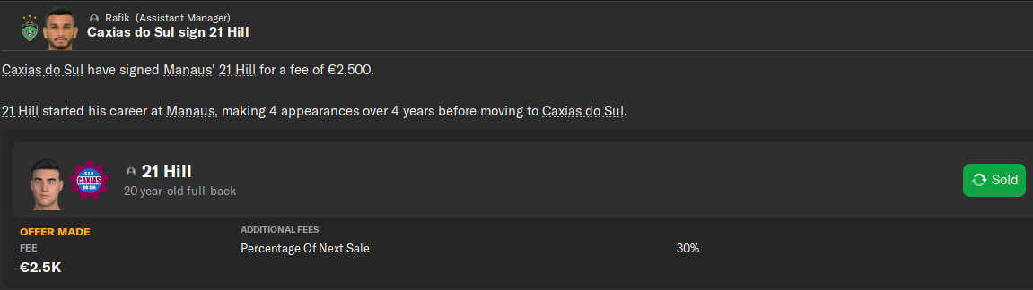 Хилл за очень скромные 2.5к и + 30% с профита от перепродажи поехал в Серию С, а именно в Caxias do Sul. У нас левый защитник совсем не прогрессировал, а сейчас ему уже 20 лет. Перспектив никаких и Любко сплавил игрока при первой же возможности. За 5 лет в команде у Хилла 4 матча и 1 гол.