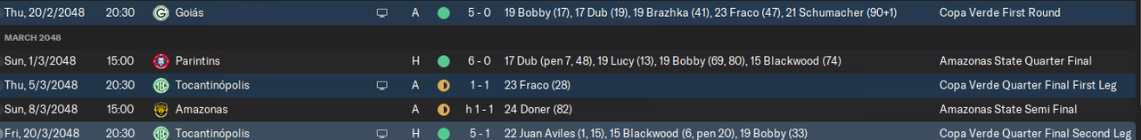 В ответке с Токантинополисом смешанным составом легко победили 5:1 и прошли в полуфинал Зеленого кубка. Из интересного - дубль Хуана Авилеса и ассист Волфа Тамбова, игравшего в защите справа.