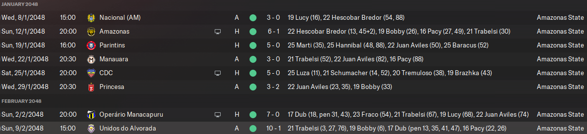 А дальше был матч открытия стадиона с Амазонасом и эту игру наши фанаты запомнят надолго! Манаус полностью контролировал игру и просто унизил исторического соперника - 6:1! Особенный матч выдал Эскобар Бредор, игравший оттянутого плеймейкера в центре поля - у полузащитника 2 гола, 2 ассиста и оценка 10.0! Еще по голу забили Бобби и Трабелси, а Пейси отметился дублем. У Хуана Авилеса один ассист.