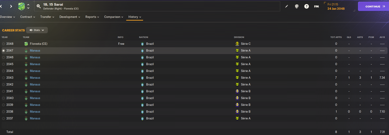 06.01.2047 12 Jobs 28 лет 251 игра 14 голов ----------> DC United  800k + 200k за 20 игр