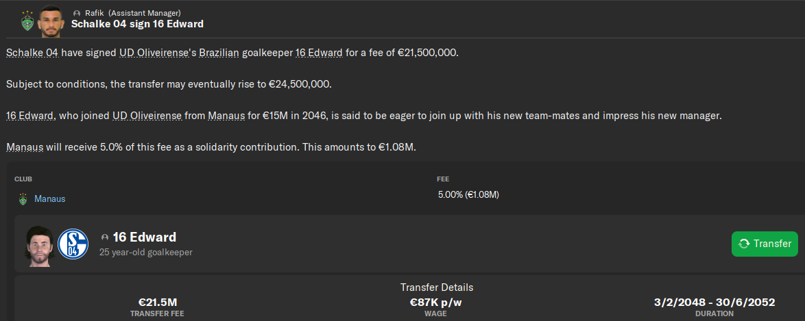 03.09.2046 16 Edward 24 года 308 игр --------> Oliveirense 15 миллионов + 3 миллиона за 50 игр + 30% с профита от перепродажи