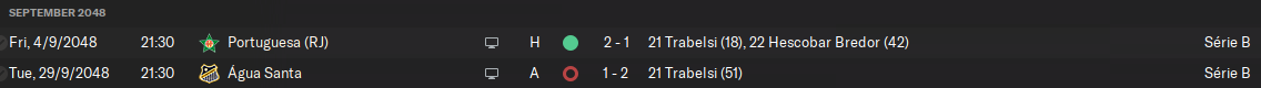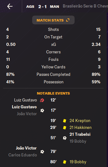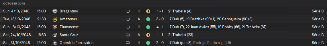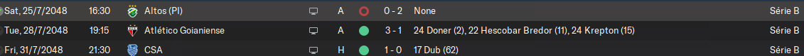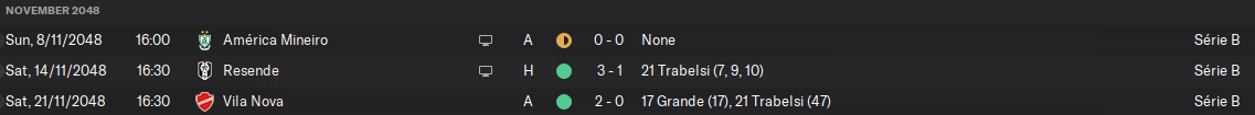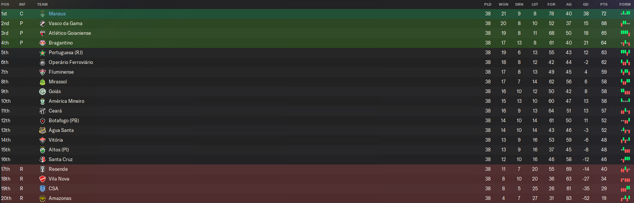 Доигрывали с Вила Новой в гостях. Соперник уже вылетел, а нам победа гарантировала первое место в таблице, поэтому Любко выпустил основу. Хозяев мы просто не заметили и могли побеждать очень крупно, но ограничились всего лишь победой 2:0. Гранде и Трабелси забили по мячу, у Эскобара Бредора 2 ассиста. Манаус побеждает в Серии В: