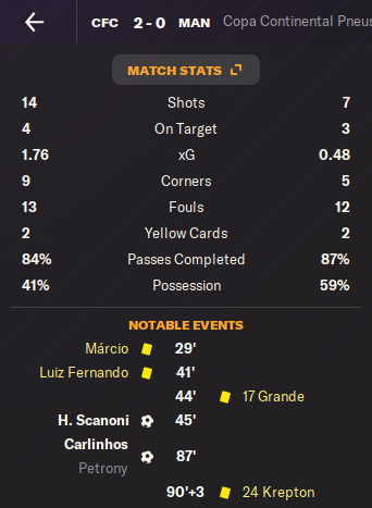 Сразу после кубка играли с Сеарой, прямым конкурентом за промоушен. Состав кое-как наскребли. Был равный матч, а как заканчиваются наши равные матчи? Правильно, поражением. Вышли вперед благодаря голу Люси, но пропустили два в конце тайма. На 84-ой Дуб сравнял после паса Ганнибала, но спустя 2 минуты мы снова пропустили. Какой-то непрекращающийся фм-ный троллинг.