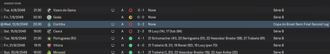 Нулевая ничья с позиции силы выводит нас в полуфинал Кубка Бразилии. Впервые в карьере Любко! На счет капнуло 806к. В полуфинале нас будет ждать Коритиба. Соперник в целом вполне проходимый. Те всего лишь середняк Серии А. Но надо ли нам это? Кубок результаты в чемпионате не перекроет.