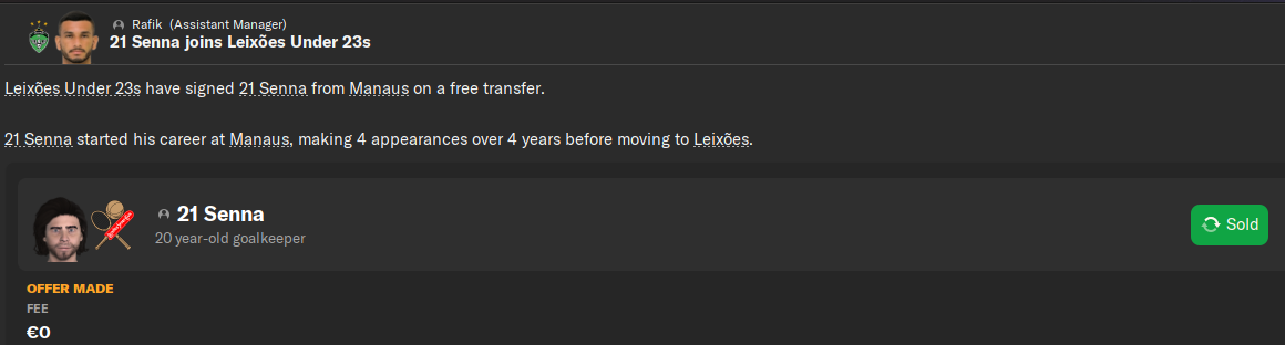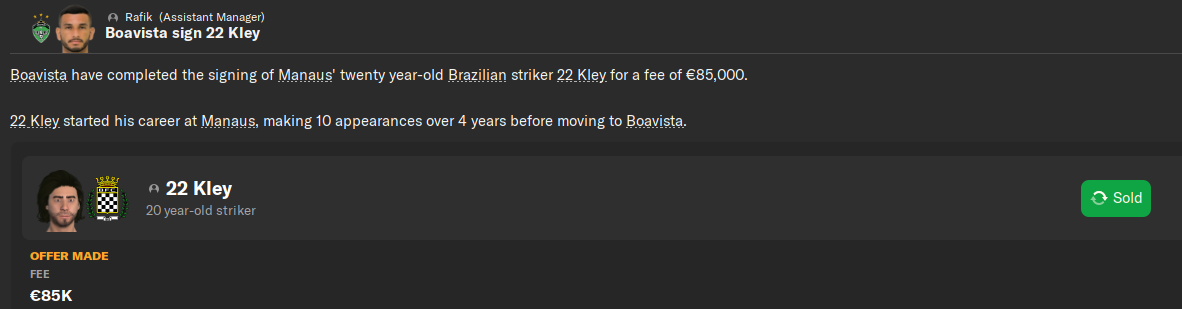 Еще один правый защитник поехал за 150к в Португалию. У нас клауза на 30% с профита от перепродажи, а так же Манаус получит еще 50к, когда Берингела сыграет за Leixoes 20 матчей. Что далеко не факт, так как статус 23-летнего защитника - игрок замены: