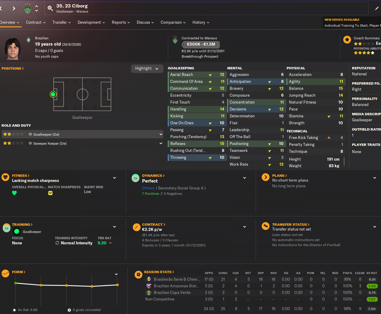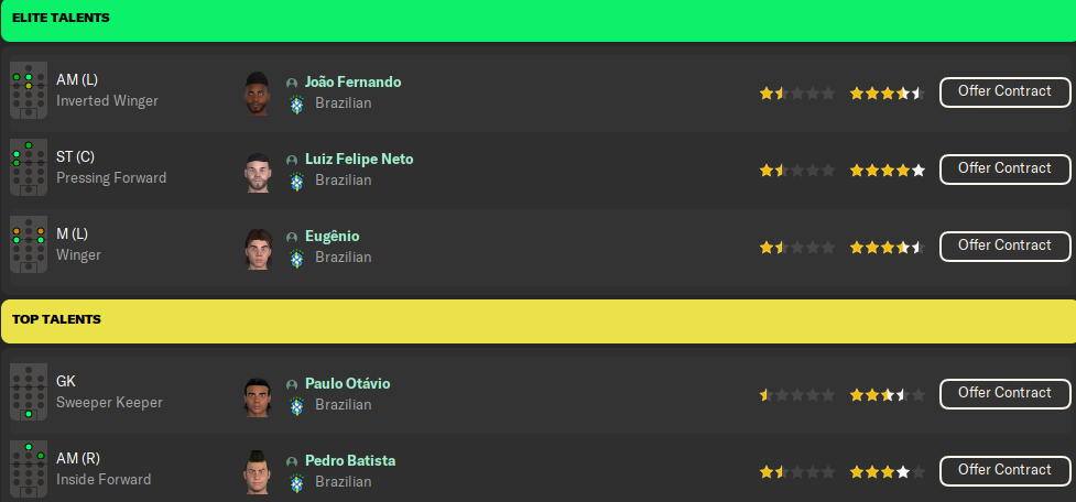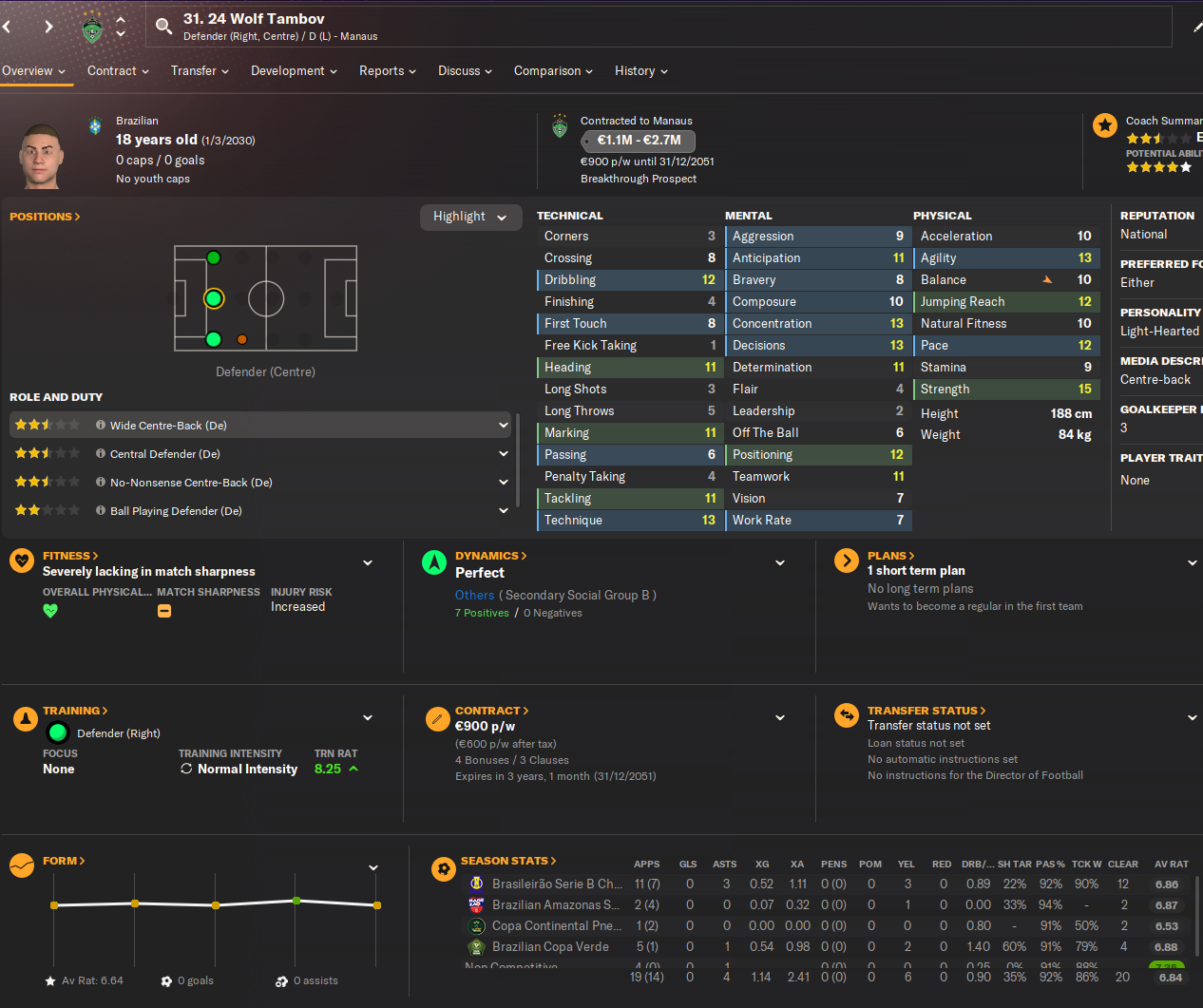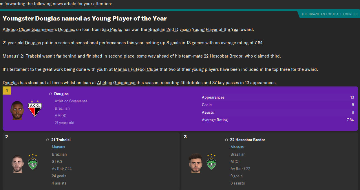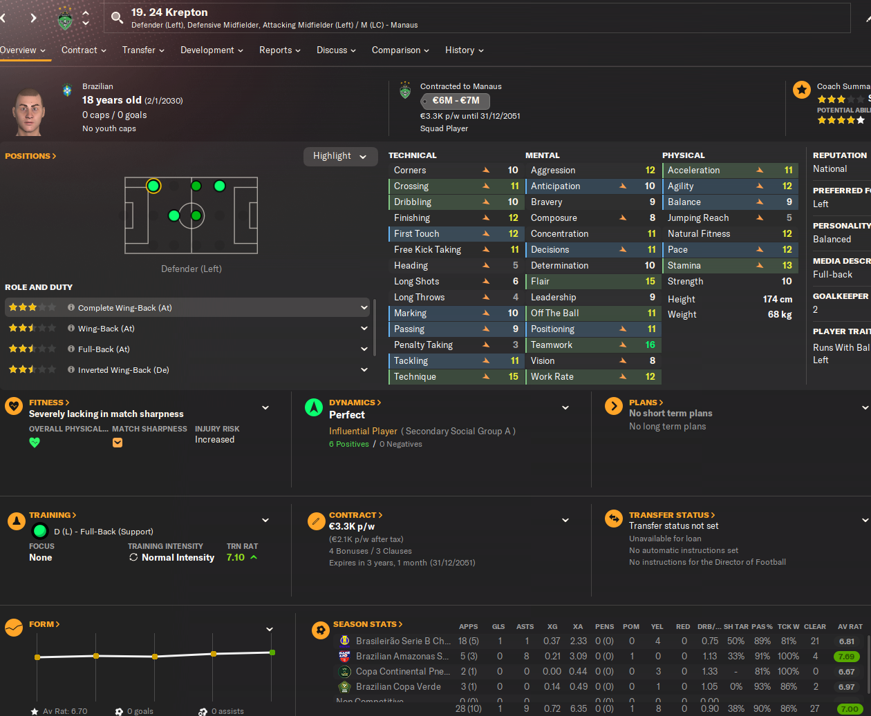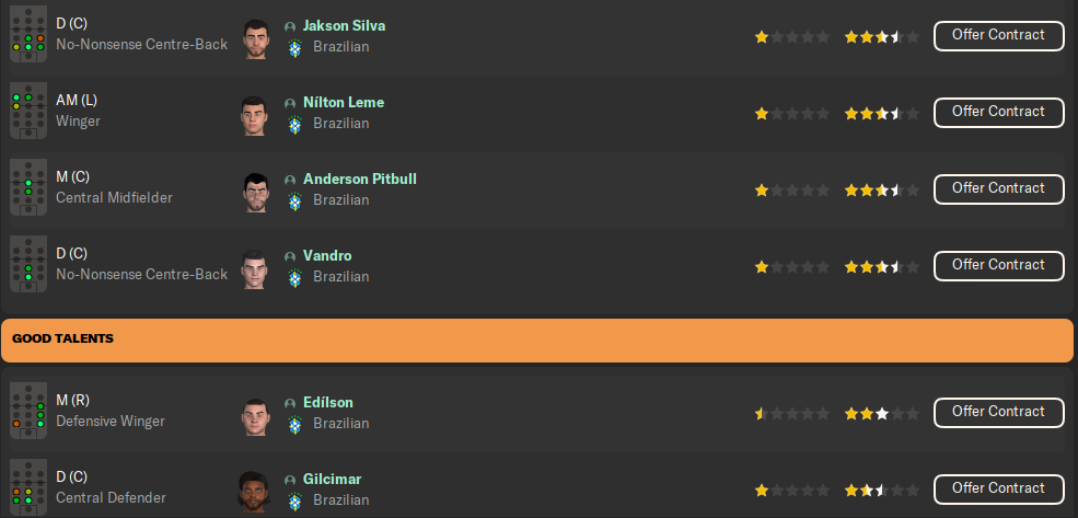 Двое других - 19-летние Санта и Роб. У обоих истекал контракт и оба хотели зарплату в 1.1к в неделю. При этом оба не особо развились, а Роб еще и неамбициозный. У обоих лишь один матч за Манаус, причем Санта в нем отметился хеттриком, а Роб сделал 2 ассиста. Но была это игра против совсем слабого соперника в чемпионате штата.