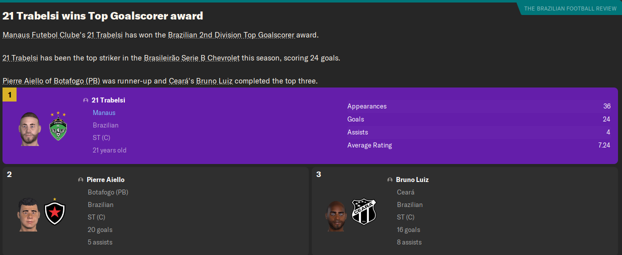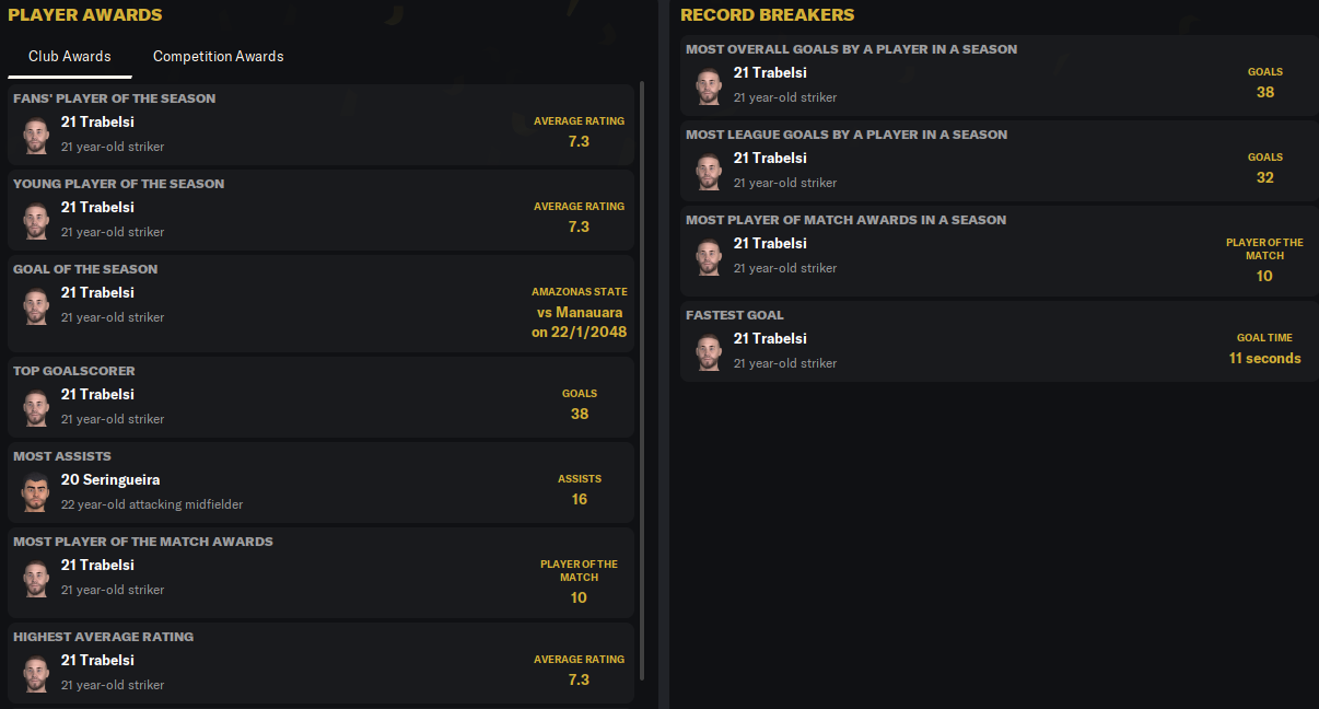 Табличка с наградами выглядит забавно. Там фигурирует практически один Трабелси. Итак юный нападающий стал игроком года, молодым игроком года, лучшим бомбардиром, забил гол сезона, чаще всего получал награду игрока матча и имеет самый высокий рейтинг. И только лучший ассистент - Серингейра с 16 голевыми пасами.