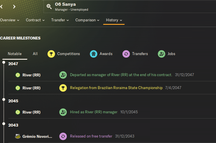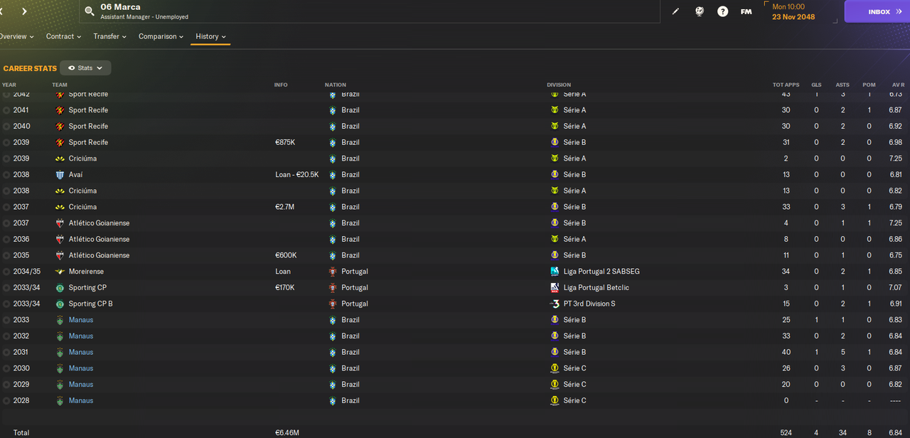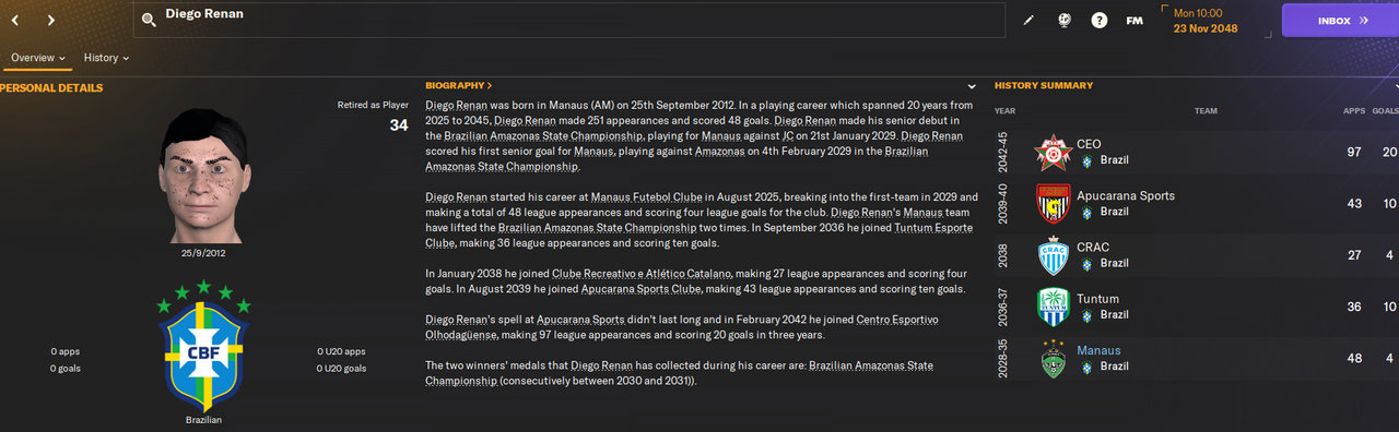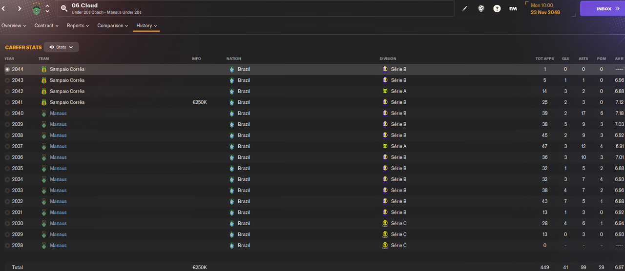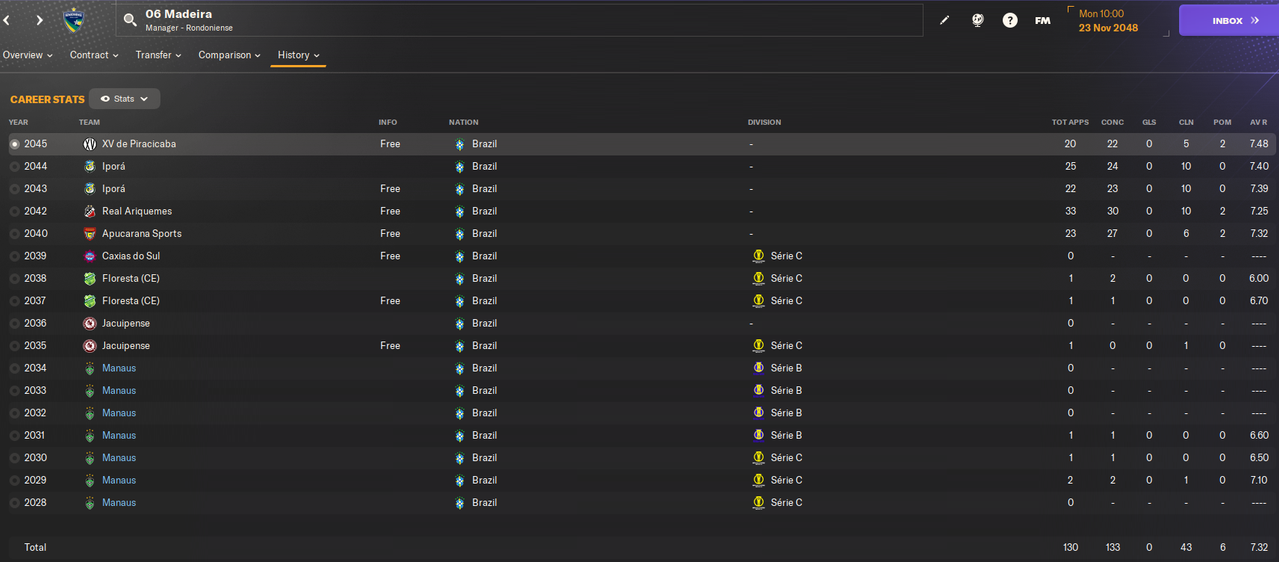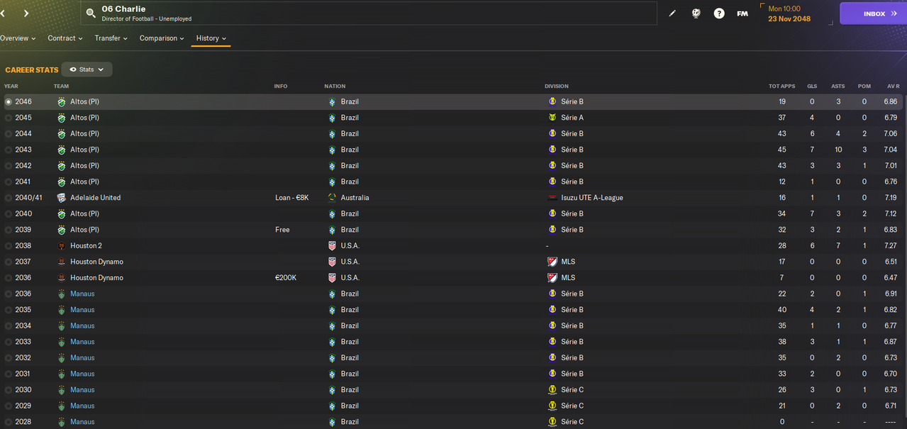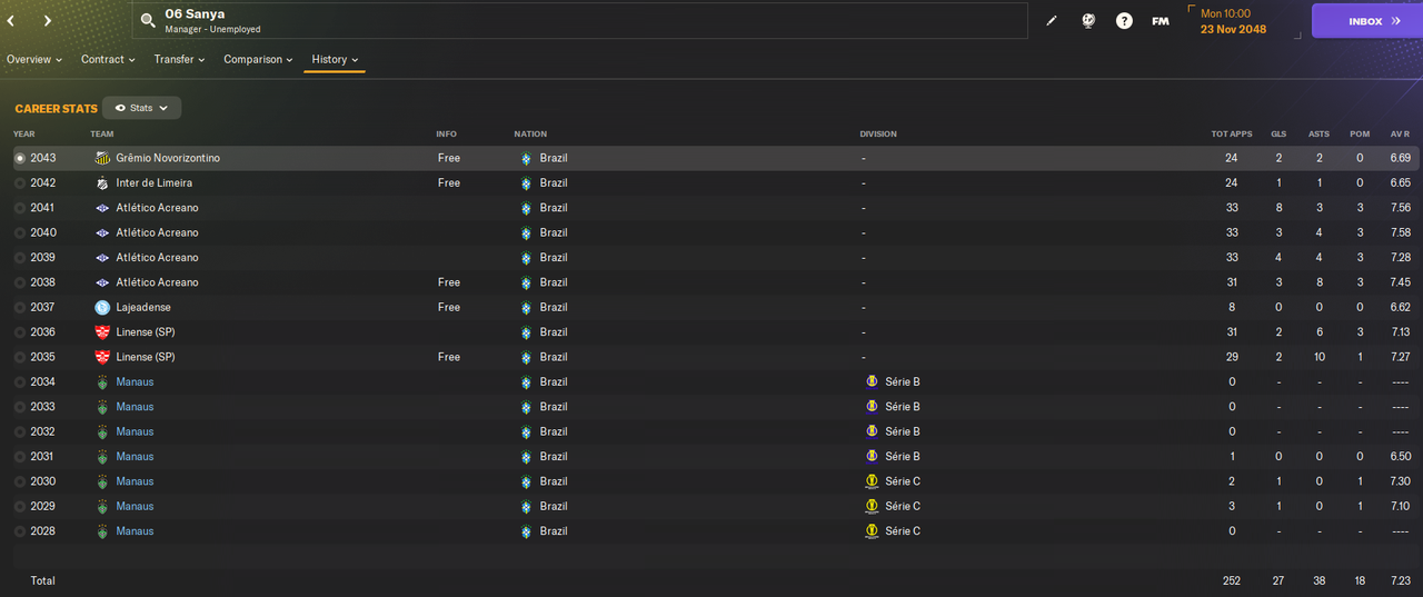 Двое других - 19-летние Санта и Роб. У обоих истекал контракт и оба хотели зарплату в 1.1к в неделю. При этом оба не особо развились, а Роб еще и неамбициозный. У обоих лишь один матч за Манаус, причем Санта в нем отметился хеттриком, а Роб сделал 2 ассиста. Но была это игра против совсем слабого соперника в чемпионате штата.