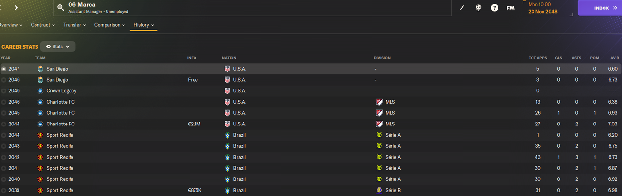 А зачем те его взяли? Правильно! Под задачу промоушена в Серию А! И на этот раз Марка успешно справился с этой задачей, играя в основе, а потом еще и закрепился в команде на самом высоком уровне. 4 сезона Марка успешно играл за Ресифе в Серии А, где выходил на поле в том числе против Манауса. А потом уехал на заработки в США. Шарлотт выложил за игрока 2.1 миллиона и Марка провел в клубе из МЛС три сезона. По истечении контракта остался в США и еще 3 года скорее числился в командах ниже уровнем. И только в прошлом году в возрасте 35 лет закончил карьеру, став ассистентом менеджера:
