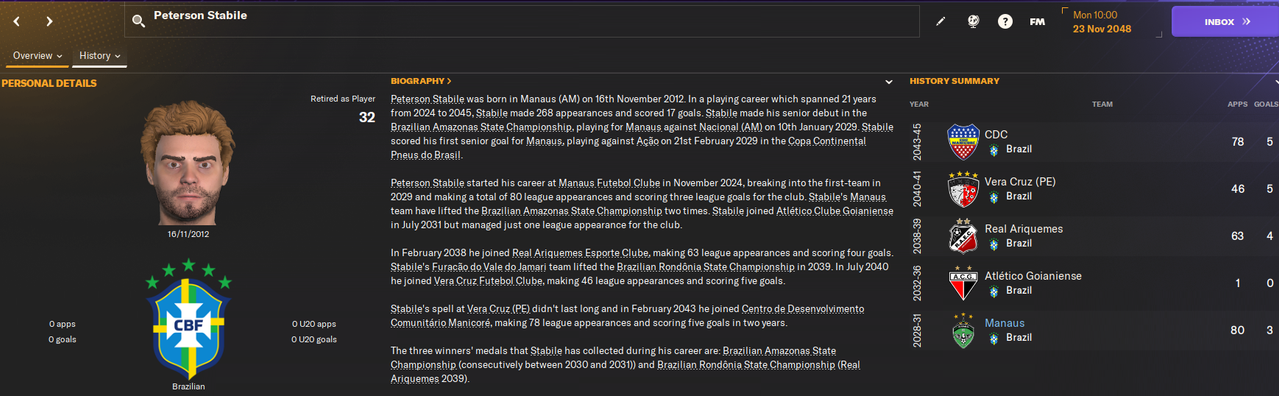 12.02.2048 21 Hill 20 лет 4 игры 1 гол ----------> Caxias do Sul 2.5k + 30% с профита от перепродажи