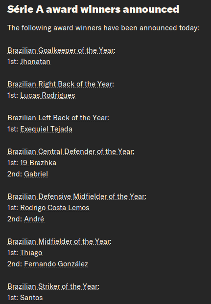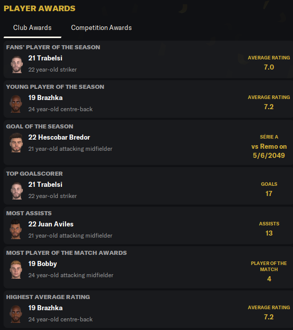 Лучший игрок - 22-летний Трабелси, а лучший молодой игрок 24-летний Бражка. Как это работает все еще непонятно. Лучший бомбардир - Трабелси с 17 голами (9 в Серии А), лучший ассистент - Хуан Авилес с 13 пасами (4 в Серии А).