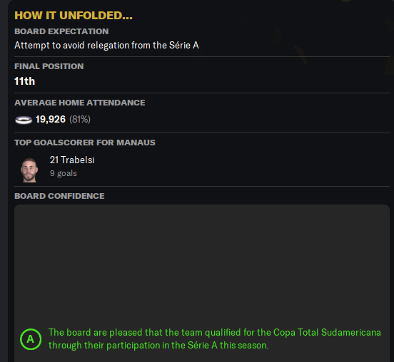 Цитата: N1ghtW01f от 14 января 2026, 19:47:25Мы на своем месте в серединке. Следующий сезон обещает быть интересным. Манаус возвращается на международную арену!
