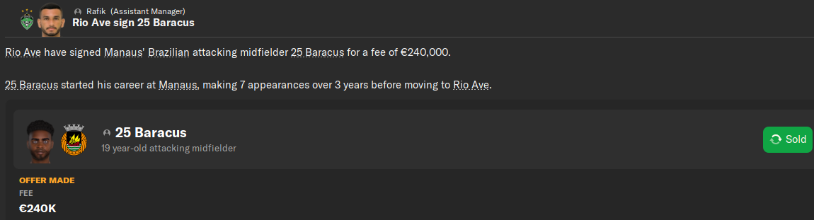 Баракусом интересовались несколько бразильских клубов и португальский Риу Аве. Предлагали копейки и бонусы за матчи и всякие перепродажи. Любко хотел все деньги здесь и сейчас. В итоге удалось развести Форталезу на 200к, а потом Риу Аве перебил их предложение и предложил 240к. Любко, конечно, с радостью согласился: