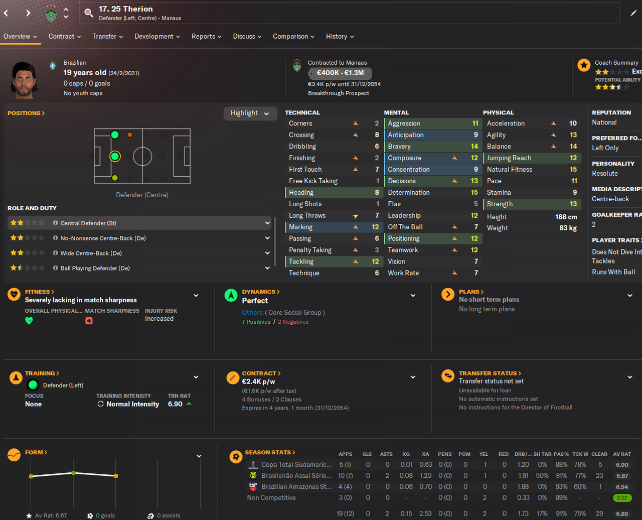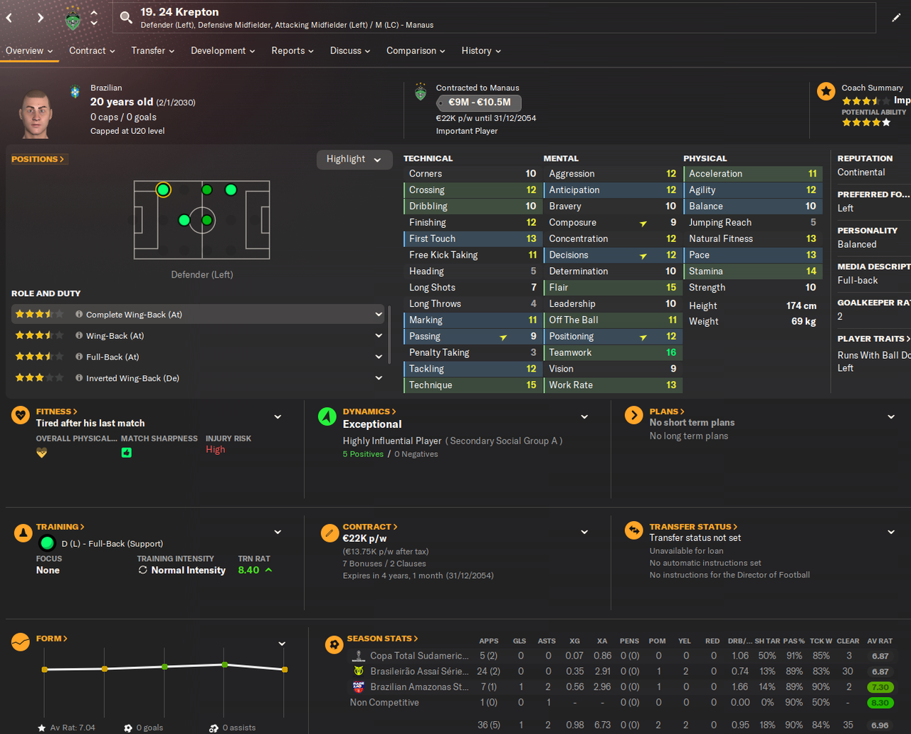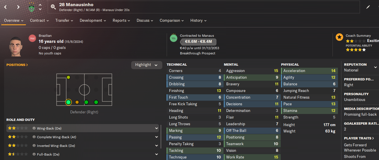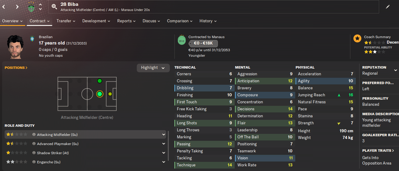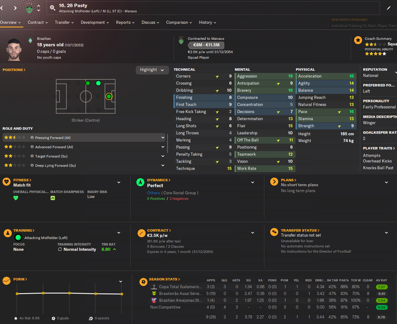 По скиллам наверное лучший арчибальда из всех, что когда-то вылуплялся из нашей академии. Вот хоть сейчас ставь в основу и он там явно ничего не испортит. Номинальная цена тоже вполне себе намекает. При этом способен играть как сзади, так и атакующего вингера. Но есть огромное "но" - характер. Неамбициозность и полное отсутствие решительности. Будет ли расти даже при наличии игровой практики? Ну вот и проверим. Заодно нужно специально под него сделать тренировочную группу с опытными наставниками. Короче типичный бразилец в общем и манаусец в частности - таланта гора, а в голове ветер и карнавал.