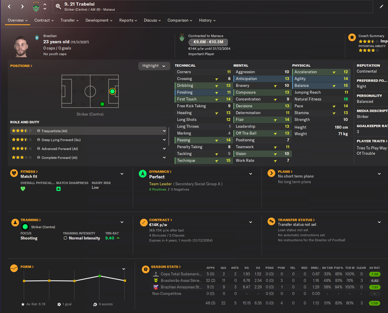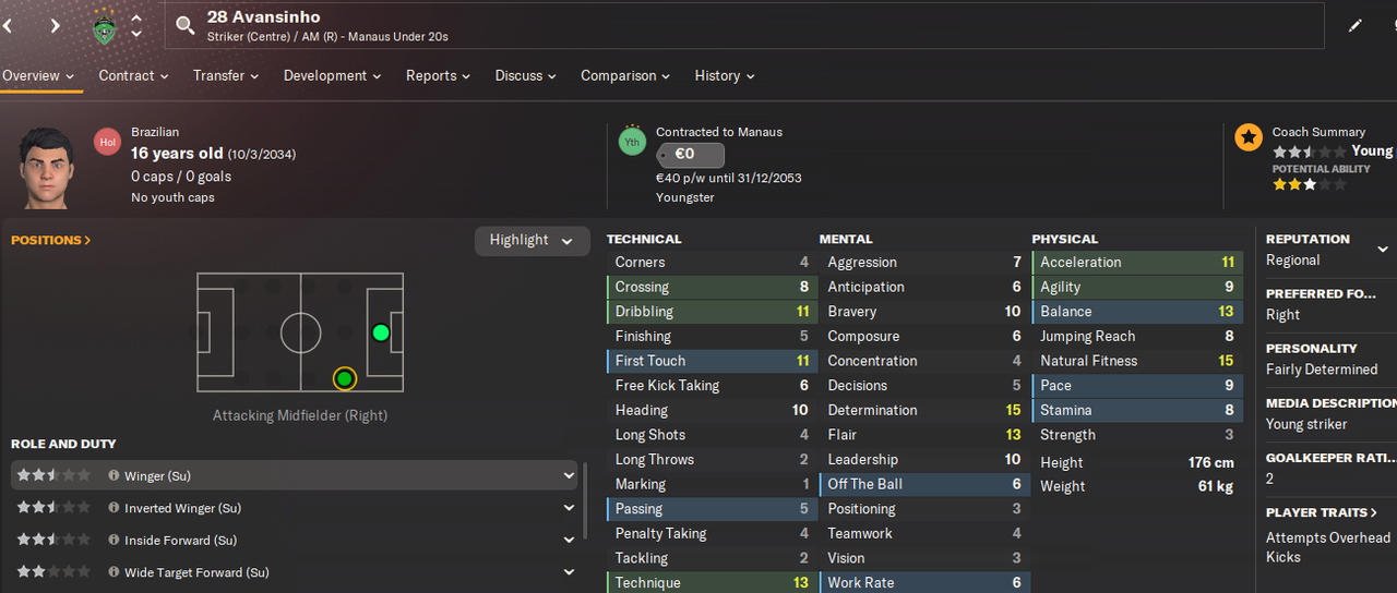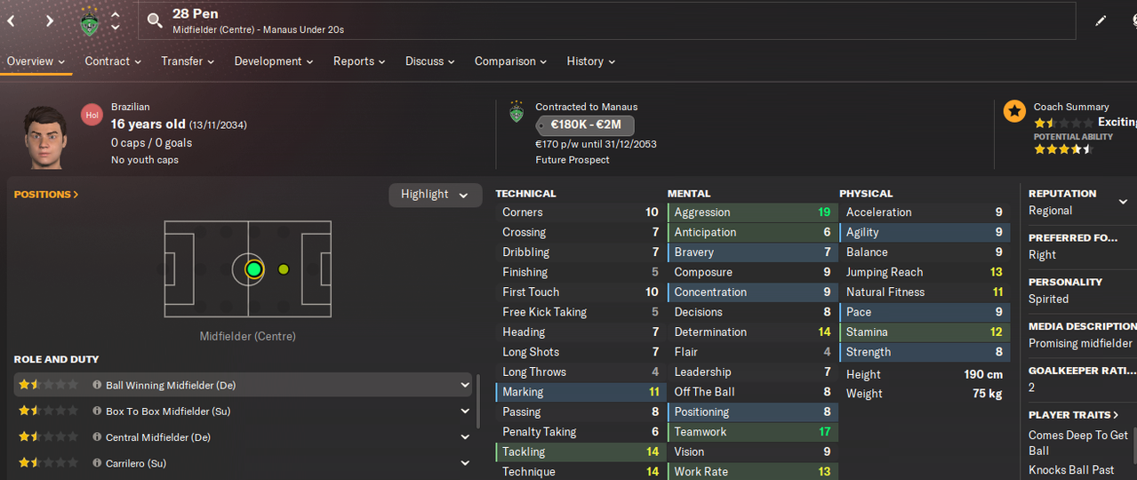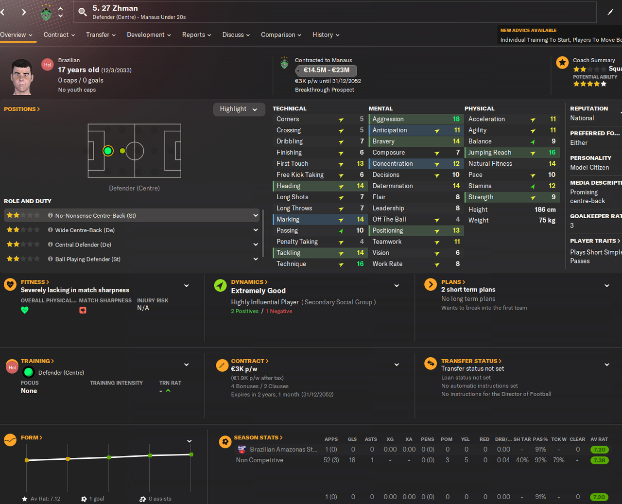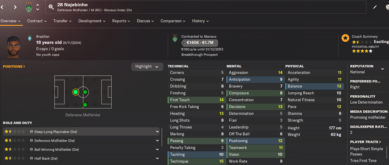 По скиллам наверное лучший арчибальда из всех, что когда-то вылуплялся из нашей академии. Вот хоть сейчас ставь в основу и он там явно ничего не испортит. Номинальная цена тоже вполне себе намекает. При этом способен играть как сзади, так и атакующего вингера. Но есть огромное "но" - характер. Неамбициозность и полное отсутствие решительности. Будет ли расти даже при наличии игровой практики? Ну вот и проверим. Заодно нужно специально под него сделать тренировочную группу с опытными наставниками. Короче типичный бразилец в общем и манаусец в частности - таланта гора, а в голове ветер и карнавал.