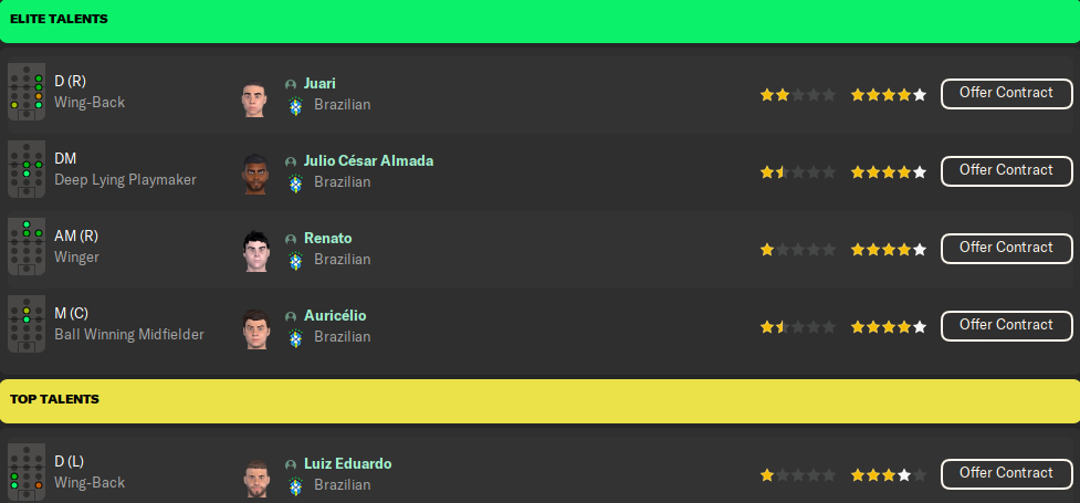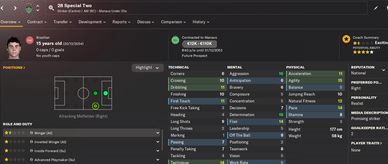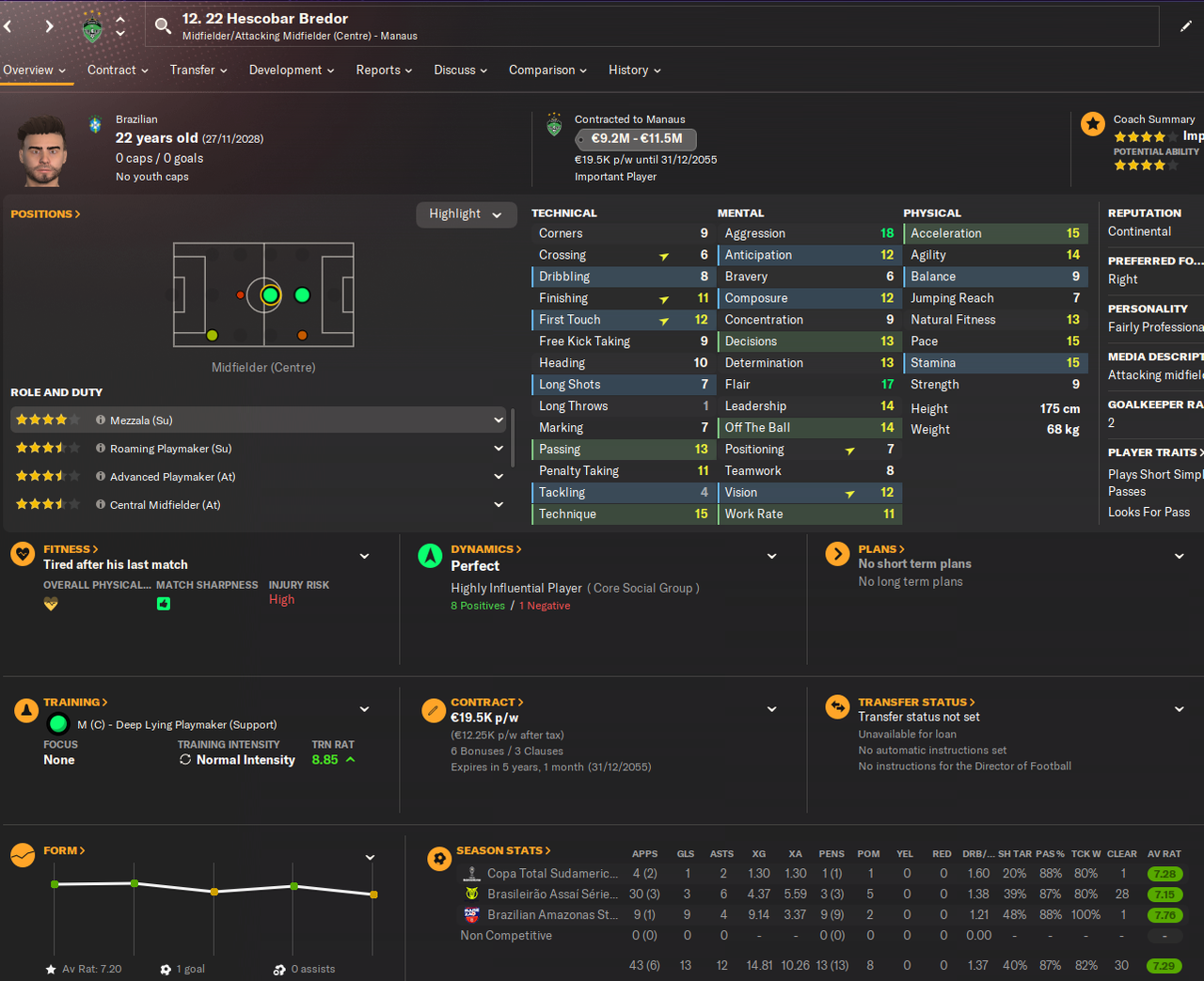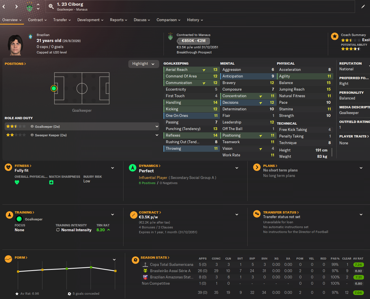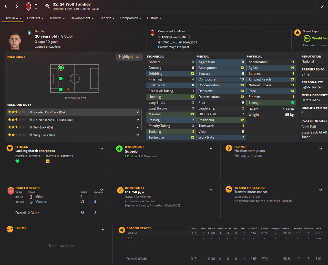 По скиллам наверное лучший арчибальда из всех, что когда-то вылуплялся из нашей академии. Вот хоть сейчас ставь в основу и он там явно ничего не испортит. Номинальная цена тоже вполне себе намекает. При этом способен играть как сзади, так и атакующего вингера. Но есть огромное "но" - характер. Неамбициозность и полное отсутствие решительности. Будет ли расти даже при наличии игровой практики? Ну вот и проверим. Заодно нужно специально под него сделать тренировочную группу с опытными наставниками. Короче типичный бразилец в общем и манаусец в частности - таланта гора, а в голове ветер и карнавал.