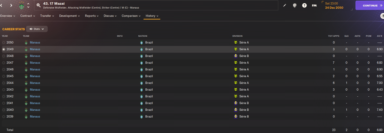 Мазаю тоже 27 и ситуация идентичная, только игр за Манаус чуть больше - 40, ну и 2 гола. Ну и матчи более равномерно распределены по сезонам.