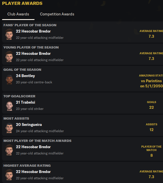 Эскобар Бредор не получил должного признания на уровне всей лиге, зато в Манаусе полузащитник собрал все награды - и игроку года, и молодому игроку года! Лучший бомбардир уже традиционно Трабелси с 22 голами (11 в Серии А), а распасовщик - Серингейра с 12 ассистаvи (в Серии А, правда, только 4). У того же совсем юного Барни для сравнения целых 7.