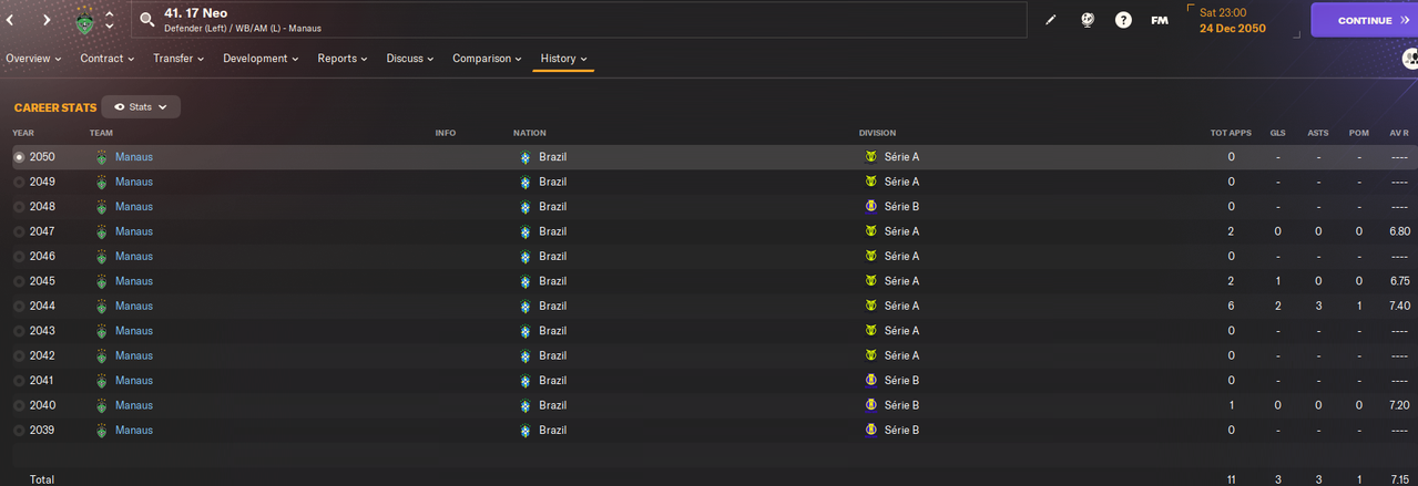 Миникака  уже 27 лет, и у него только 22 игры за Манаус. Ну и 1 гол. Из них 19 в сезоне 2044 года, когда игрок был в ротации. Продать его долго не получалось и в итоге полузащитник досидел до конца контракта.