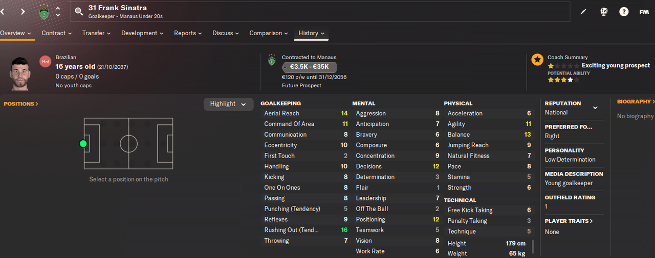 Да. Парня буквально самого по себе зовут Фрэнк Синатра. Ну тут что-то менять - только портить. Не самый перспективный вратарь, не факт, что в другое время я стал бы его вообще подписывать, но тут нам нужен кто-то в молодежку. В команде после продажи Сайборга только 3 голкипера.