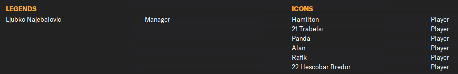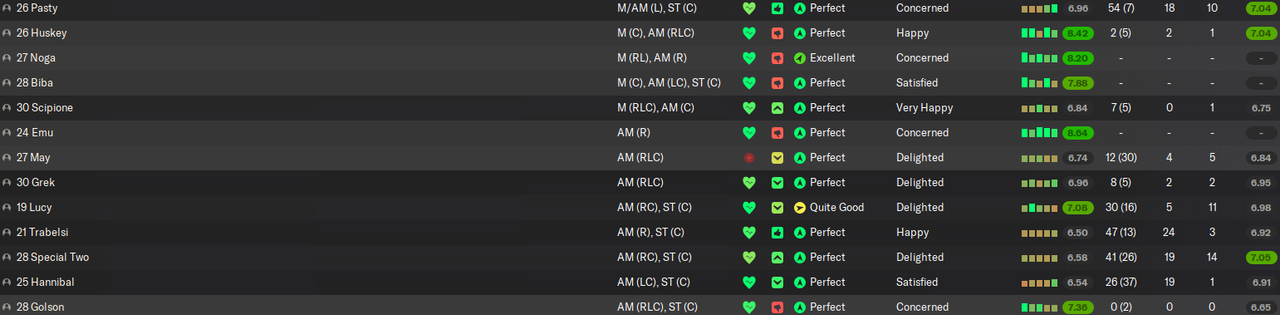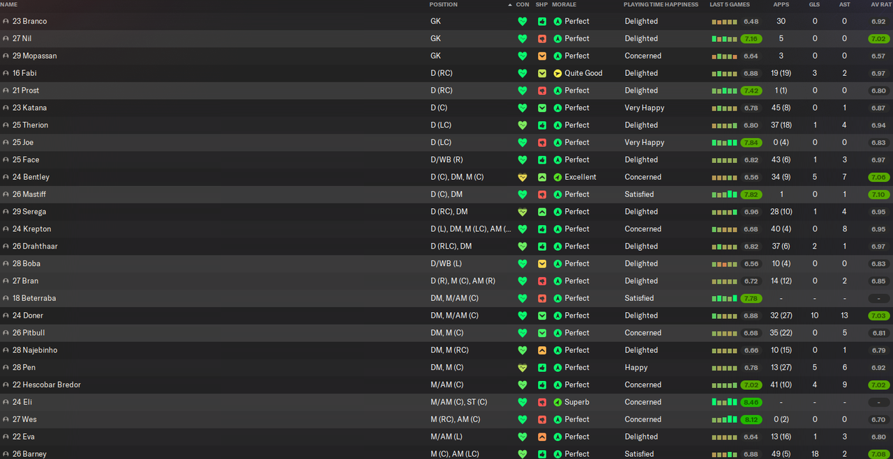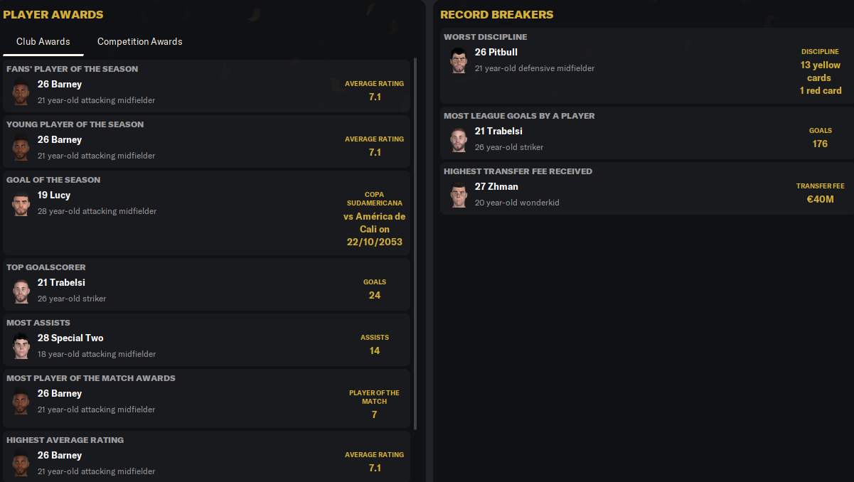 Ну и у нас новый игрок года - Барни, который сейчас в самом деле вырос в настоящего лидера. Он же и молодой игрок года. Лучший бомбардир старый - Трабелси с 24 голами. В Серии А, правда, только 11, но там мы часто играли вторым составом. Ну и лучший ассистент - все тот же Спешал Ту с солидными 14 голевыми передачами.