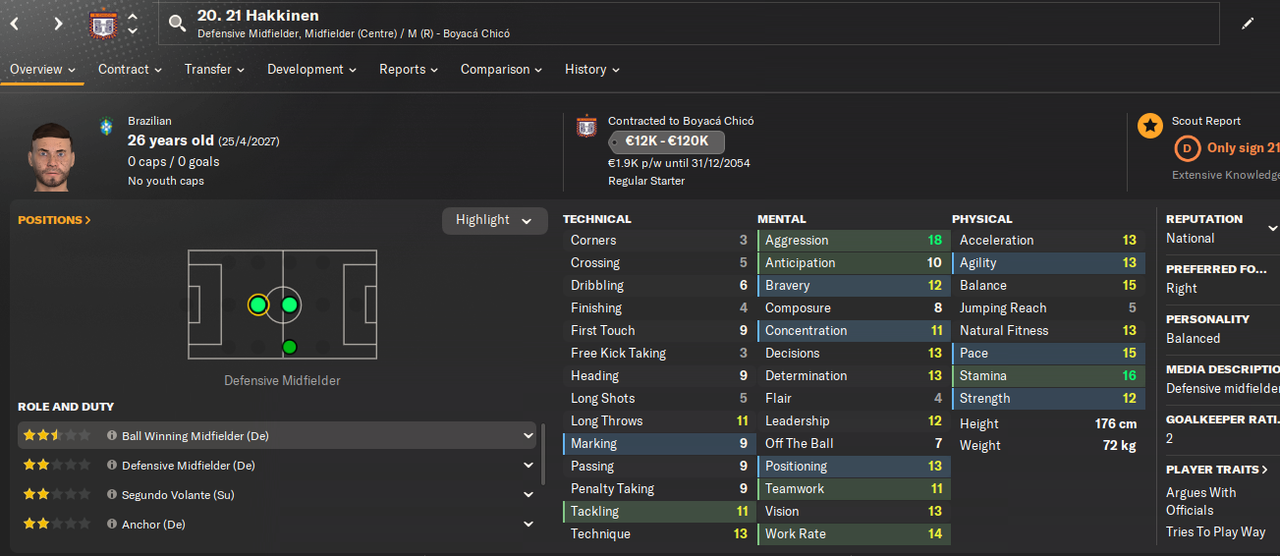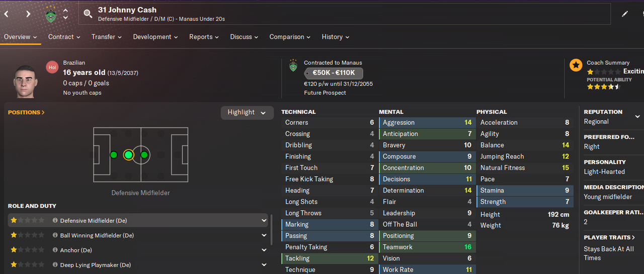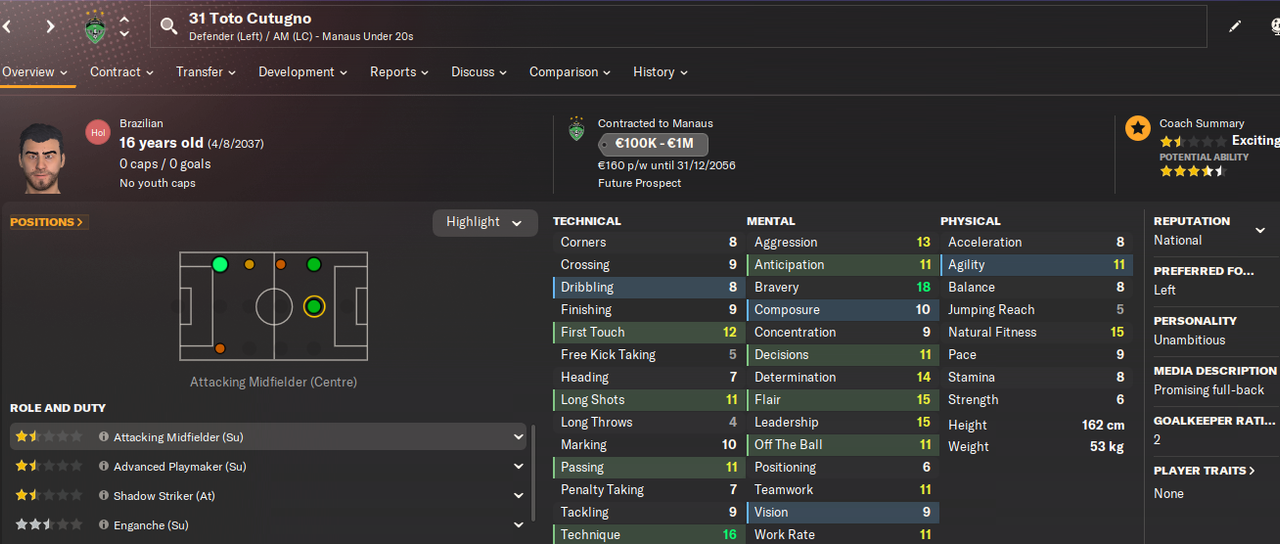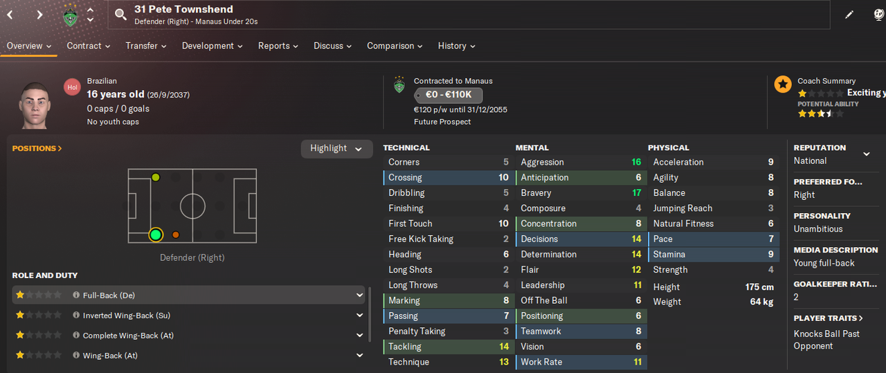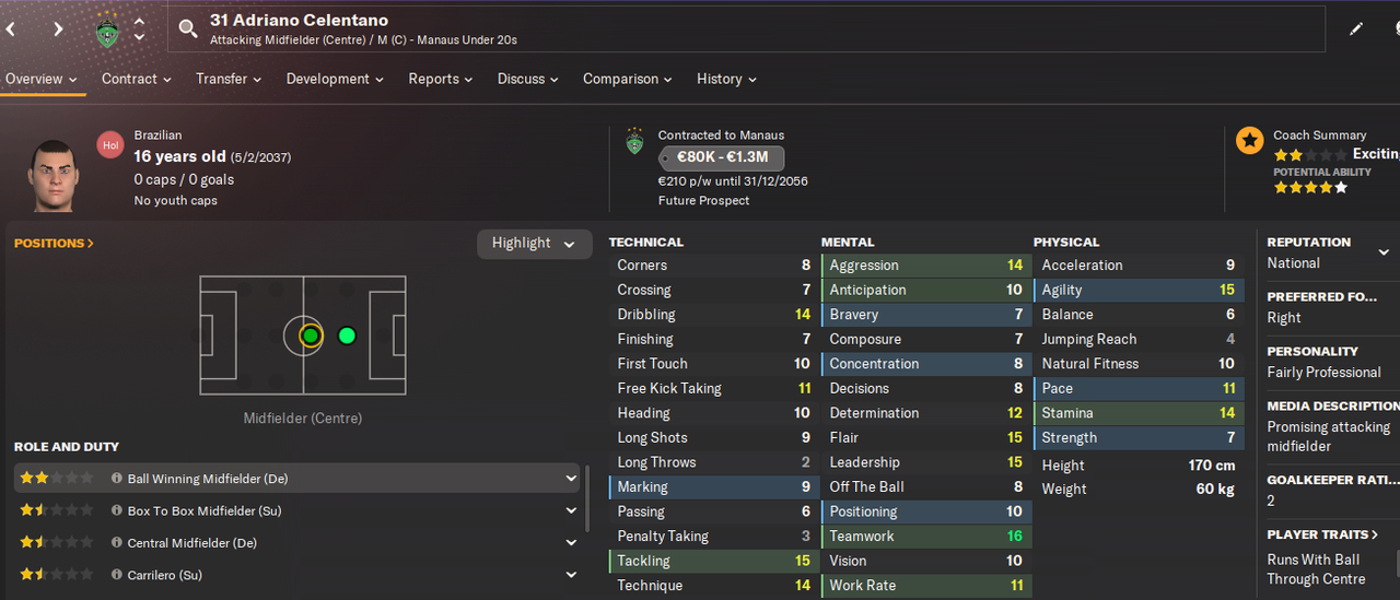 Имя Чао сразу навевает какие-то итальянские мотивы, так что назван в честь певца итальянского. Какая-то бешеная менталка, очень хорошие технические, но отвратительный неамбициозный характер и плохая физуха. Ну и габариты совсем миниатюрные. Тут ни о каком левом защитнике речь, конечно, не идет. Будем растить фантазисту в слоте АМ С.